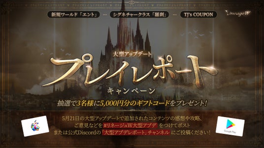 新規ワールド「エント」やシグネチャークラス「羅刹」、「TJ’s COUPON」などアップデートで追加されたコンテンツの感想や攻略、ご意見などをハッシュタグ「#リネージュW大型アプデ」を付けてXに投稿、または公式Discordの「大型アプデレポート」チャンネルにご投稿ください。ご投稿いただいた方の中から抽選で3名様に5,000円分のApple Gift CardもしくはGoogle Playギフトコードをプレゼントします。