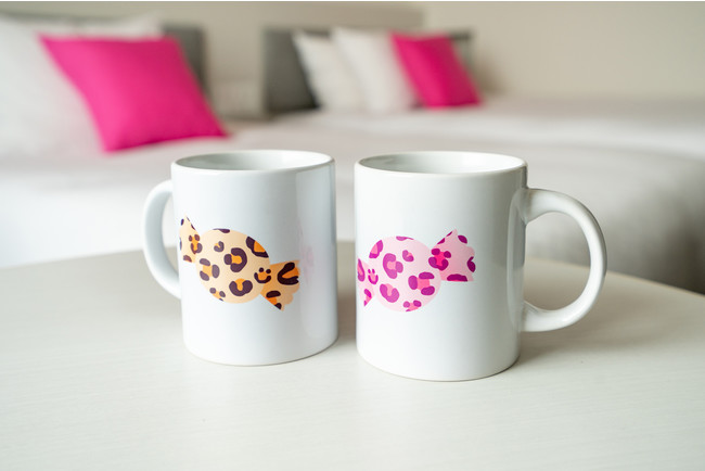 ▪アメちゃんねこと同じヒョウ柄のクッションやオリジナルマグカップを設置