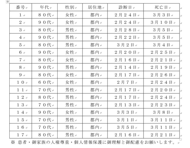 2022-03-15 東京都 新型コロナウイルスに関連した患者の死亡について Tweet ~新型コロナウイルス感染症に関する東京都からのお知らせ~ 都内で新型コロナウイルスに感染した方が死亡されましたのでお知らせします。 お亡くなりになった方のご冥福をお祈り申し上げます。 企業プレスリリース詳細へ PR TIMESトップへ 公式ツイッター Follow @Straightpress 最新情報をTwitterで受け取ろう! 公式フェイスブックページ 最新情報をFacebookで受け取ろう! 前の記事 一覧へ戻る 次の記事