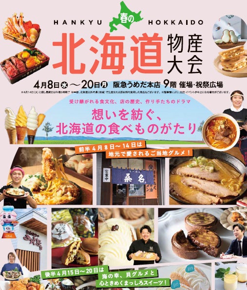 阪急うめだ本店で開催する国内催事のなかでも、一番人気の春の風物詩「春の北海道物産大会」。今回は、前半は、ご当地グルメ・北海道らしいスイーツや銘菓が登場。後半は、貝グルメ・見た目にも美しい“まっしろスイーツ”を特集します。さらに、単なる食のイベントにとどまらない、北海道の食の未来を担う承継者たちにスポットを当てた商品も登場します。ほかにも、会場で楽しむイートイングルメや食材の宝庫である北海道の素材をふんだんに使用したお弁当やスイーツなど、約100店舗が集結するこの時期ならではの北海道の魅力が満載です!