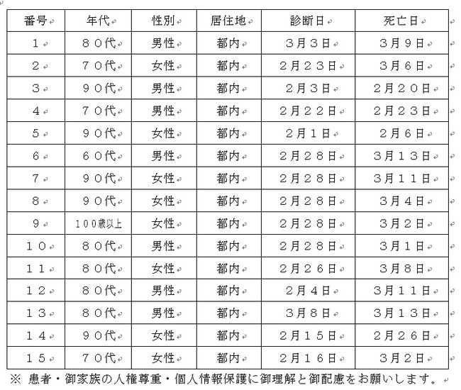 2022-03-15 東京都 新型コロナウイルスに関連した患者の死亡について Tweet ~新型コロナウイルス感染症に関する東京都からのお知らせ~ 都内で新型コロナウイルスに感染した方が死亡されましたのでお知らせします。 お亡くなりになった方のご冥福をお祈り申し上げます。 企業プレスリリース詳細へ PR TIMESトップへ 公式ツイッター Follow @Straightpress 最新情報をTwitterで受け取ろう! 公式フェイスブックページ 最新情報をFacebookで受け取ろう! 前の記事 一覧へ戻る 次の記事