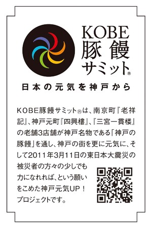 KOBE豚饅サミット(R)︎は南京町『老祥記』、神戸元町『四興樓』『三宮一貫楼』の老舗3店舗が神戸名物である「神戸豚饅」を通し、神戸の街を更に元気に、そして2011年3月11日の東日本大震災の被災者の方々の少しでも力になれれば、という願いをこめた神戸元気UP!プロジェクトです。