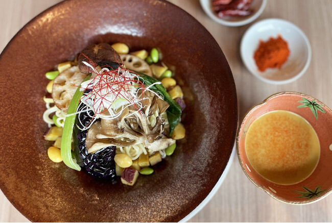夏季限定メニューとして好評の「冷やし担々麺」。厳しい残暑が続きそうな9月より、秋バーションで新登場いたします!コクと旨味が特長の胡麻スープと、甘辛く味付けした肉味噌、添えられた野菜を冷麺と一緒に混ぜながらお楽しみいただく逸品です。しっかりとしたボリュームの具材は、茄子、きのこ、銀杏、さつま芋など、一足早く“秋”のイメージに!ツルリとした食感の冷麺を、こだわりの自家製ラー油の味わいと共に、ご堪能いただけます。また、お客さまのご要望に応じて、辛さは3段階。その日の気分やお好みで、ノーマル・中辛・大辛よりお選びください。