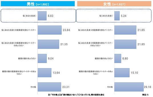 男女ともに「私(あなた自身)」と回答した割合は1割も満たず、「義理の親」の介護は「自分自身が担うべきだ」と考える割合は、「実の親」の介護と比べ大幅に少ないことが分かりました。