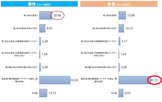 また、男性が「私(あなた自身)」と回答した割合は20.88%に対して、女性が「私(あなた自身)」と回答した割合は13.89%で、男性の方が女性よりも実の親の介護費用を負担している(負担していく予定である)割合が高いことが分かりました。