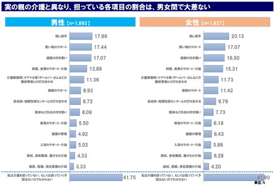 「実の親の介護に関して、あなたが実際に担っていること、もしくは担っていく予定のことを教えてください」という質問に対して、男性と女性の結果の比較が以下となります(図2)。