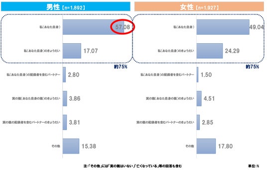 また、男女ともに「私(あなた自身)」と「私(あなた自身のきょうだい)」の割合を合計すると約75%となり、「実の親」の介護は「自分自身か、もしくは自分自身のきょうだいがすべきだ」というのは男女ともに共通の考えであると思われます。