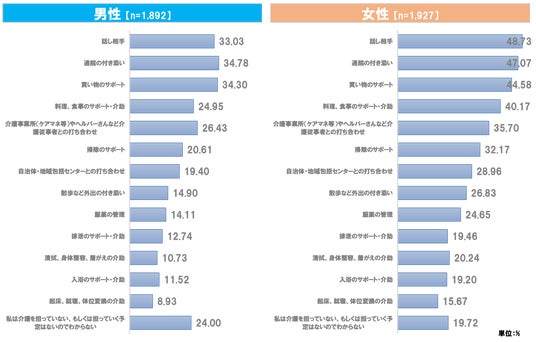 男女ともに担っている(担っていく予定である)介護項目は、「話し相手」、「通院の付き添い」、「買い物のサポート」が上位3つで同じですが、女性の方が男性に比べて担っている(担っていく予定である)介護項目の割合は全てにおいて高いという結果になりました。