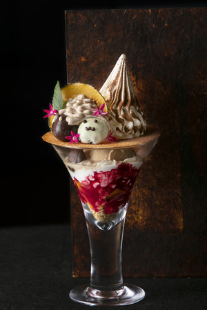 グラスには下から、ライスパフ・グラノーラ・マシュマロにカシスのソース・クレームシャンティ・ほうじ茶アイスを重ねています。秋の味覚である、ほっくりとしたカボチャのシロップ煮と栗の渋皮煮も入り、食べ応えのある内容です。カシスソースは茜さす山肌や紅葉を演出するのみならず、爽やかな味が甘さにアクセントを添えます。