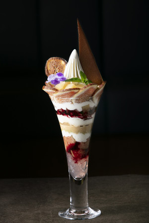 美しい色彩の断面のほか、まるでレースのように端正にグラスの縁を飾るイチジクのスライスなど、美麗なルックスにも心が躍るパフェです。