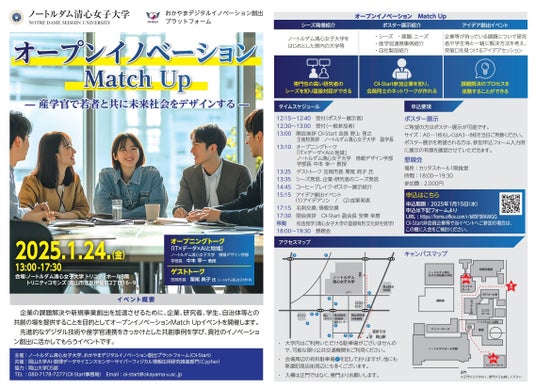国立大学法人岡山大学(本部:岡山市北区、学長:那須保友)が事務局を務める「おかやまデジタルイノベーション創出プラットフォーム(OI-Start)では、ノートルダム清心女子大学ともに、2025年1月24日(金)、産学官連携で地域課題の解決を目指す「オープンイノベーション Match Up」を、ノートルダム清心女子大学トリニティホール3階トリニティコモンズで開催します。