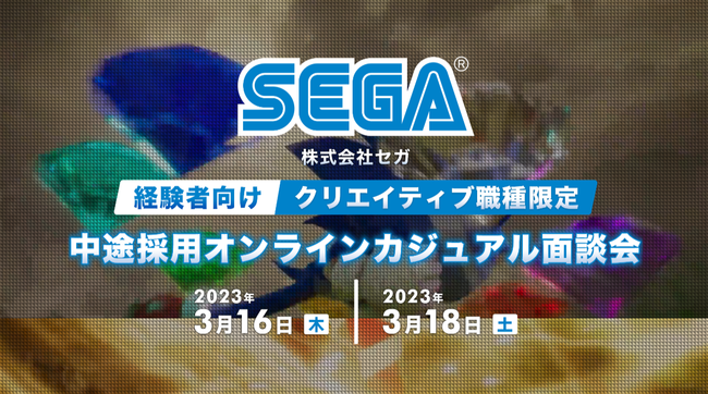 株式会社クリーク・アンド・リバー社(C&R社)は3月16日(木)・18日(土)、アーティストやデザイナー、プログラマーなどのゲームクリエイターの方々を対象に、株式会社セガの中途採用オンラインカジュアル面談会を開催いたします。