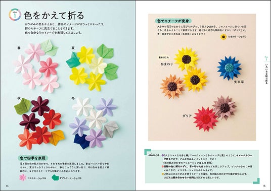 同じ花を異なる色で折り、「春・夏・秋・冬」それぞれのイメージに。ひまわりは別の色で折ると「ダリア」や「矢車草」にも見立てられる。