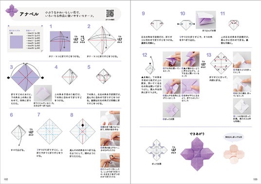 登場するおりがみモチーフの折り方は、図と写真でわかりやすい。むずかしめのものは紙面の二次元コードから折り方動画にアクセスでき、細部も確認できます。