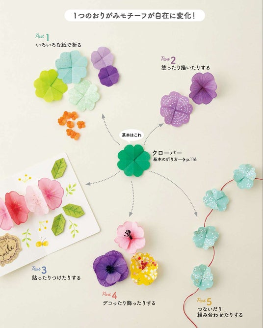 「クローバー」は簡単に折れて、便利なモチーフの代表格。花芯をつければ花にも見立てられ、小さめに折ればキンモクセイやアジサイに変身。平らなフォルムなので、模様をつけたりカードに貼ったり自由自在。