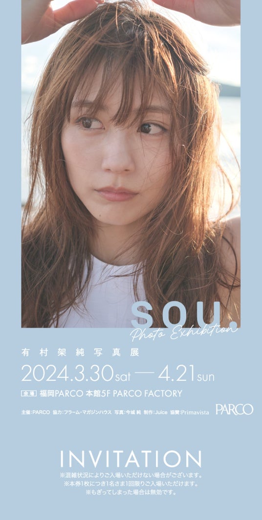 福岡PARCO(福岡県福岡市中央区天神2-11-1)は、2024年3月30日(土)~4月21日(日)の期間、有村架純さん初となる写真展”有村架純 写真展「sou.」“を開催いたします!