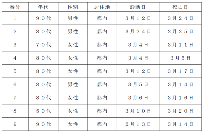 都内で新型コロナウイルスに感染した方が死亡されましたのでお知らせします。