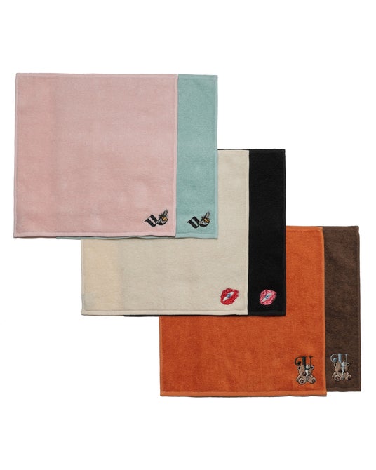 蜂、ベア、リップが刺繍されたミニタオル。明るいカラートーンも揃えて、プレゼントにもおすすめです。