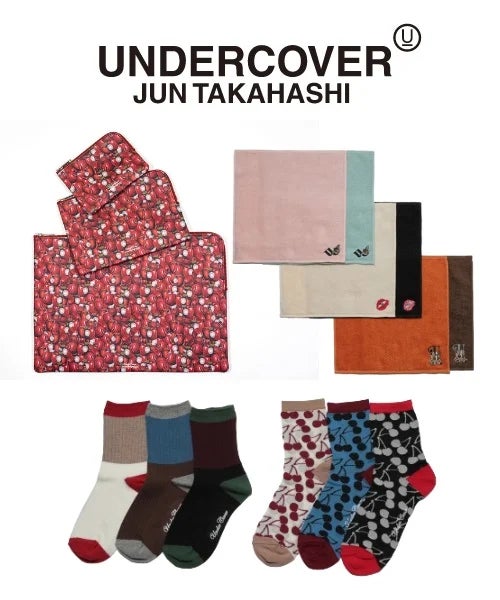1990年に高橋盾氏が立ち上げたアパレルブランド<アンダーカバー>とのコラボレートは「We Make Noise Not Clothes(服ではなく、ノイズをつくる)」というスローガンのもと、独創的でメッセージ性の高いコレクションを展開しています。蜂、ベア、リップが刺繍されたミニタオル、カラーブロッキングやチェリーモチーフがキュートな靴下はギフトにもぴったり。また、ブランドのアイコンデザインでもあるりんごモチーフ“ギラップル(GILAPPLE)”をあしらったポーチは、ブランドとしても初の試みです。