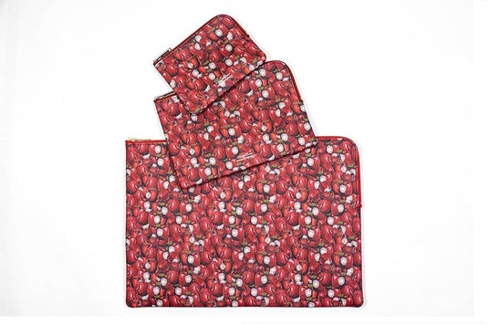 りんごモチーフ“ギラップル(GILAPPLE)”をあしらったポーチは、鍵やリップが入る〈ポーチS〉、スマホの充電器やハンドクリームなどが入る〈ポーチM〉、〈ポーチA4〉は資料やPCが入る大きさの全3サイズ。10月23日(水)からのPOPUPにてお披露目となります。