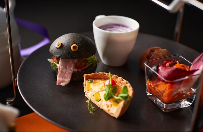 少しずつ黄色に色づく御堂筋のイチョウ並木に臨むラウンジで、ゆったりとしたハロウィンを楽しんでいただけるアフタヌーンティーセットをご用意します。本年は、“花で彩った楽しいハロウィン”をイメージし、上段には色鮮やかなエディブルフラワーをあしらい、求肥のオバケやモンブランのミイラなど遊び心もあるスイーツを並べました。下段のセイヴォリーも、ベーコンの舌を出した竹炭バンズのオバケバーガーや、ハロウィンカラーの紫芋のポタージュ、カボチャとサーモンのキッシュなど、可愛らしさたっぷりの食べ応えある内容です。