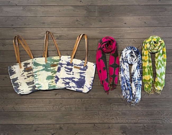 今回のポップアップショップでは、RefuSHEで支援を受けている若い女性たちが手染めで製作した、一つひとつ模様や色合いが異なる、一点もののタイダイ染めストール&バッグを紹介します。