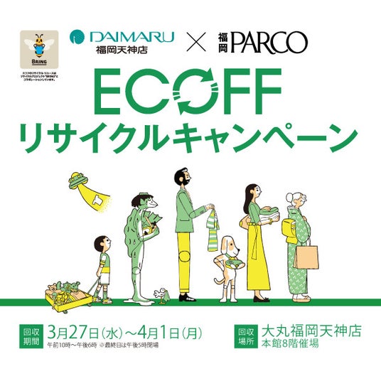 大丸松坂屋で始まった活動「ECOFF」(エコフ)と福岡PARCOの共同プロジェクト。お客様から回収した衣料品・靴・バッグなどを、燃料をはじめとした各種資源にリサイクルをいたします。