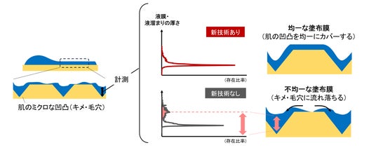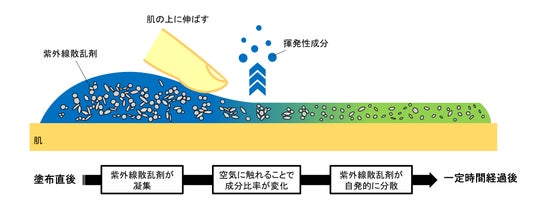 肌に塗布すると、凝集していた紫外線散乱剤が肌の上で均一な状態へと自発的に変化し、肌の形状に合わせて透明な均一膜を形成する、新たな日焼け止め技術です。