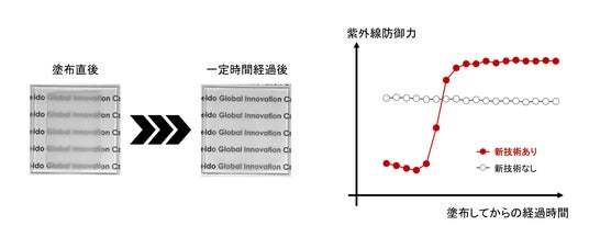 図2 塗布膜の見た目と紫外線防御力の経時変化の様子