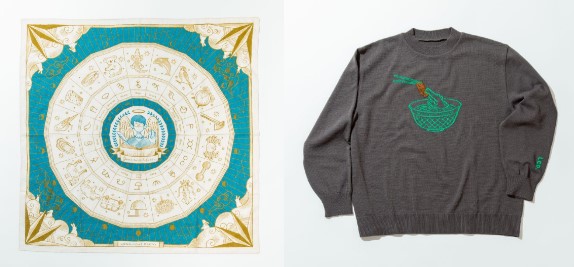 ワニ、サイ、イルカ、鉄アレイ、そして肉うどんと、ネタに登場する転生モチーフをホロスコープ風にデザインし、インテリアやファッションにもなじむイラストで描いた大判マルチクロスと、肉うどんの中に潜むワニをジャカード織りでほどこしたニットトップス。お肉の部分はもこもこの糸で肉感を出し、袖口にさりげなく「LCD」とコンビのロゴを入れるなど、細部まで世界観とファッション性を追求しています。