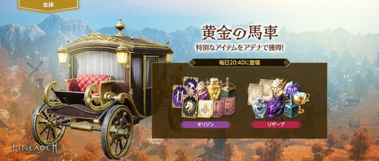 期間中、アデン大陸の各村に、毎日20時40分から21時40分までの間、「黄金の馬車」が出現します。「黄金の馬車」は「オリジン ワールド」ではレベル65以上のキャラクターが、「リザーブ ワールド」ではレベル60以上のキャラクターが利用でき、アデナを使用して豪華なアイテムと交換することができます。