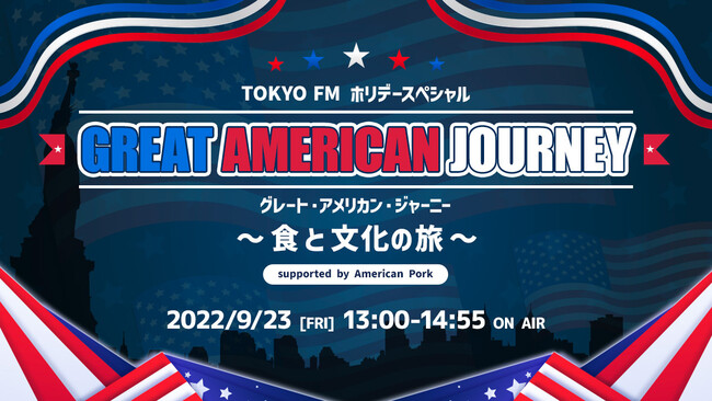 TOKYO FMでは、2022年9月23日(金・祝)13:00~14:55、TOKYO FMホリデースペシャル『グレート・アメリカン・ジャーニー~食と文化の旅~ supported by American Pork』をお届けします。アメリカ発の音楽、映画、スポーツ、食文化など、私たち日本人に大きな影響を与えたアメリカンカルチャーにフォーカスする2時間のプログラム。パーソナリティはユージと吉田明世がつとめ、ゲストには福田萌子を迎えます。どうぞご期待ください。