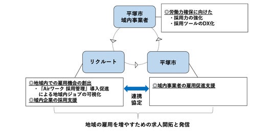 株式会社リクルート(本社:東京都千代田区、代表取締役社長:北村 吉弘、以下当社)は、2024年12月11日、神奈川県平塚市との間で雇用促進に関する協定を締結し、連携を開始することとなりましたので、お知らせ致します。『Airワーク 採用管理』で、地元企業の採用ホームページ開設を支援します。