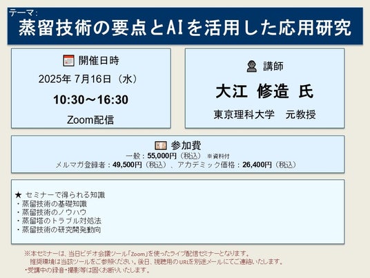 先端技術情報や市場情報を提供している(株)シーエムシー・リサーチ(千代田区神田錦町: https://cmcre.com/ )では、 各種材料・化学品などの市場動向・技術動向のセミナーや書籍発行を行っておりますが、 このたび「蒸留技術の要点とAIを活用した応用研究」と題するセミナーを、 講師に大江 修造 氏(東京理科大学 元教授)をお迎えし、2025年7月16日(水)10:30より、 ZOOMを利用したライブ配信で開催いたします。 受講料は、 一般:55,000円(税込)、 弊社メルマガ会員:49,500円(税込)、 アカデミック価格は26,400円(税込)となっております(資料付)。