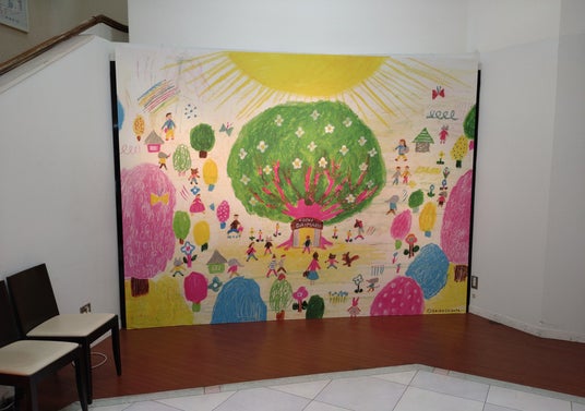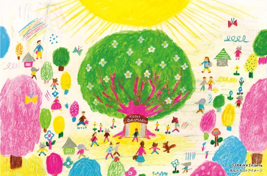 高知大丸が街の大きな木となって人々の心を潤すような色々なモノ・体験・出会いができる明るい場となってほしいという思いで描きました。