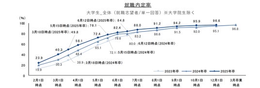 就職内定率は96.6%で、10月1日時点に比べ0.7ポイント増加。民間企業への就職確定者のうち、約4割が就職先について不安に感じていることがある
