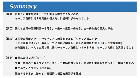 本調査レポートでは、働く個人から見える、企業の「キャリア自律支援」の課題と不調の真因を明らかにし、働く個人の「主体的なキャリア形成意欲」を個人と企業が共創するための処方と事例を示します。