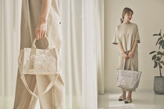 左:ショルダー付き ミニトートバッグ(アイボリー系) 右:ペアレントバッグ(ラベンダー系)