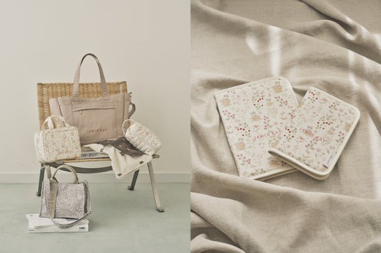 左:(上から時計回りに)ペアレントバッグ、マルチキルトポーチ、ショルダー付きミニトートバッグ、おむつポーチ 右:母子手帳ケース(M・S)