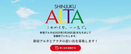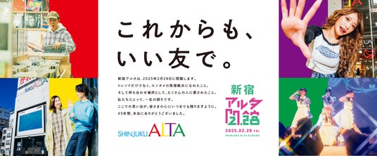 1980年4月に新宿にオープンし、これまで多くのお客さまにご愛顧いただきました「新宿アルタ」は、2025年2月28日(金)に閉館を迎える運びとなりました。ご愛顧いただきました皆さまへの45年間の感謝を込めて、「新宿アルタ・閉店イベント」を昨年2024年11月よりスタートしており、2月末日の閉館に向けて、新宿アルタらしさを大切にし、明るく楽しいイベントを開催し、営業最終日まで皆さまと共に館内を盛り上げてまいります。ぜひ、思い出を作りに新宿アルタにご来店くださいませ。