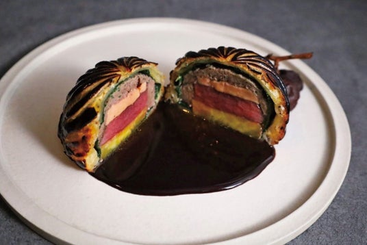ショコラを練り込んだパイ生地の中には北海道産の蝦夷鹿のシンシンが入っています。クラシカルなソースに仕上げ、カカオマスを入れてコクを出しました。