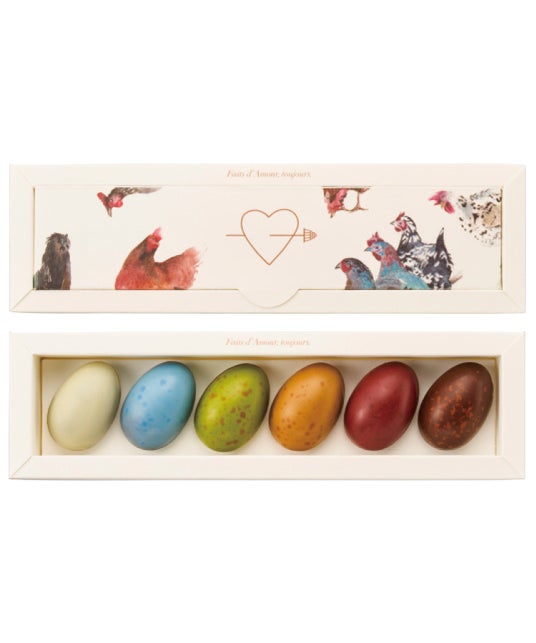 色とりどりのタマゴ型のショコラはココナッツ、そばの実、ピスタチオ、とうもろこし、ヘーゼルナッツ、カカオニブといった、それぞれ味わいが違うプラリネとキャラメルの6種類。