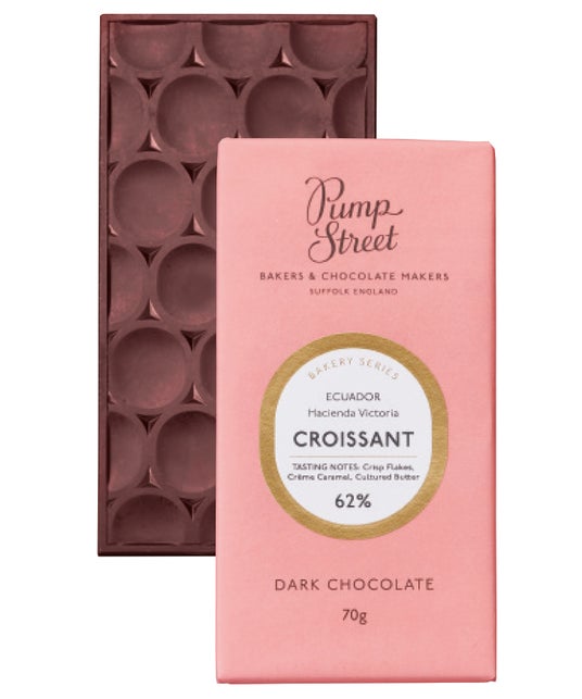 イギリスのベーカリーカフェが監修するビーントゥバーブランド<パンプストリートチョコレート>からは、ベーカリーならではのクロワッサンをチョコに混ぜ込んだタブレットが登場します。
