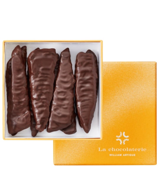 オランジェットはコルシカ島産のオレンジのコンフィを太めにカットし、ニコラ・ベルジェ氏のクーベルチュール=マダガスカル産40%のミルクチョコレートでコーティングしました。