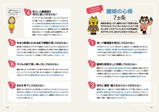 本書に協力いただいたのは、弁護士の服部弘先生と、離婚カウンセラーの岡野あつ子先生。本書内では親しみやすいキャラクターで登場!ベテランならではの豊富な知識と、離婚する人に寄り添ってくださる温かい視点で解説しています。