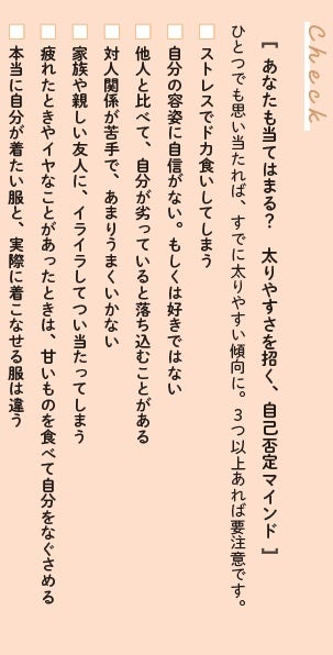 本書では、太りやすさを招く「自己否定」マインドチェックも。