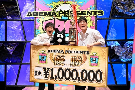 ファイナルラウンドでは、抽選によって決まった豆鉄砲、フタリシズカ、四千頭身、ファイヤーサンダーの順番でネタを披露。4組のネタが終わりいよいよ結果発表に移ると、審査員の田中卓志、日置祐貴、そして視聴者から3票を獲得したファイヤーサンダーが同票の激戦を制し、栄えある頂点に輝きました。ファイヤーサンダーに優勝トロフィーと優勝賞金100万円を贈呈した株式会社AbemaTVの藤田晋代表取締役社長は「この賞で人生変えるきっかけにして下さい」とコメントを寄せました。