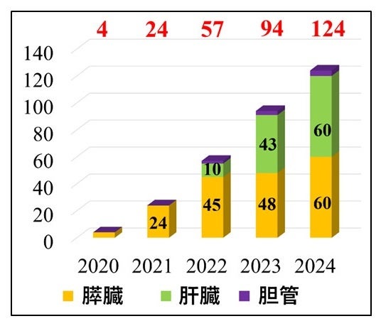 2020年開始の肝胆膵疾患に対するロボット支援膵切除術を皮切りに、2022年開始のロボット支援下肝切除術、ロボット支援総胆管拡張症手術で症例を重ね、2024年12月時点で、肝胆膵領域のロボット手術件数の合計が300例に到達しました。
