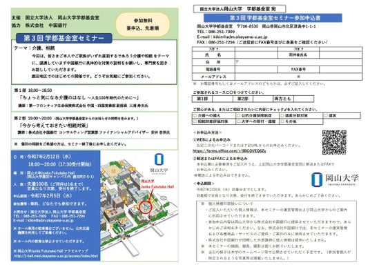 国立大学法人岡山大学(本部:岡山市北区、学長:那須保友)の学都基金室では、中国銀行に協力いただき介護や相続をテーマとしたセミナーを、2025年2月12日(水)18:00~20:00に本学津島キャンパスにある Junko Fukutake Hall(J Hall)で開催いたします。