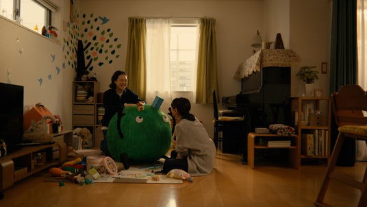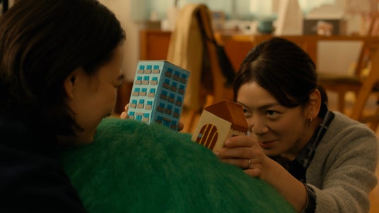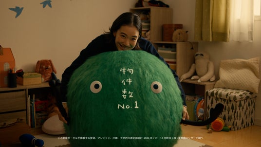 その後、スーモの手を取ってぬいぐるみ遊びのように「買うも借りるもSUUMO!物件数ナンバーーーワン!」とかわいらしく言う妹。続けて姉も「マンション、戸建ても!」と息ぴったりの合いの手を入れながら、おもちゃのマンションと家をスーモの頭に乗せてニッコリ。思わず妹が「なんちって」と言い、子どもの頃に二人でままごとをしていたことを思い出すようにほほ笑み合いました。